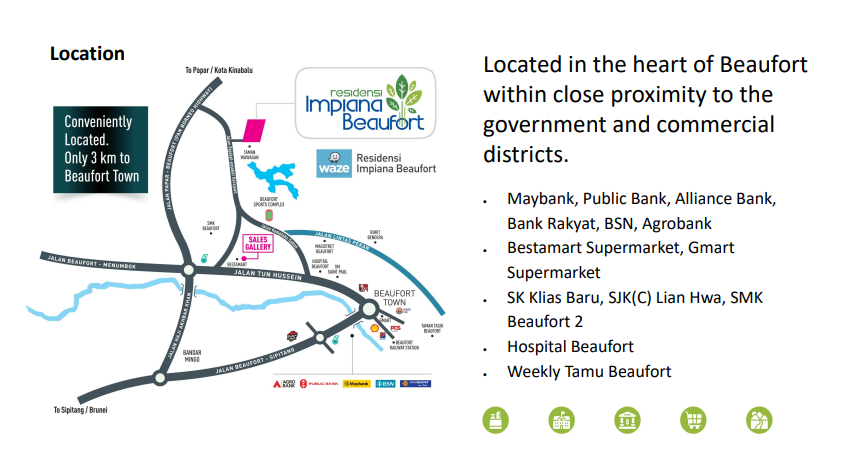 Lokasi strategik, berdekatan dengan Pekan Beaufort, Pejabat-pejabat kerajaan, Sekolah, Hospital, Balai Polis, Bank, Kedai dan macam-macam lagi